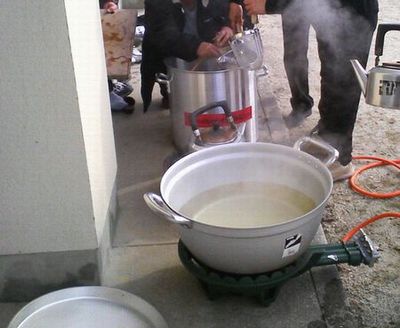中でも婦人部の方が無洗米をビニール袋に入れて炊き出しテスト・・・