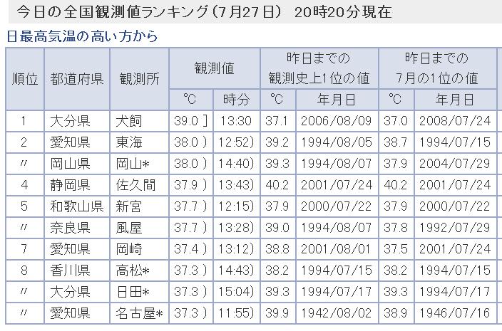 26日に岐阜県多治見市で観測の39.0度と並び、今夏最高。