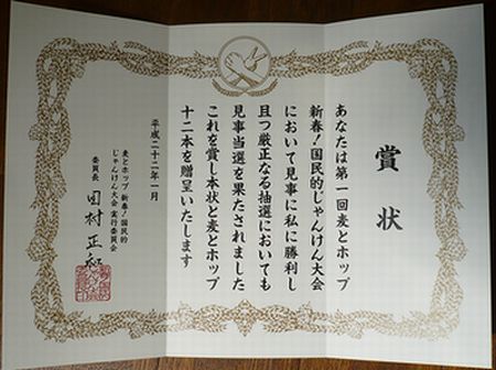 「新春! 国民的じゃんけん大会で田村正和さんに勝った記念に、もらった麦とホップです。