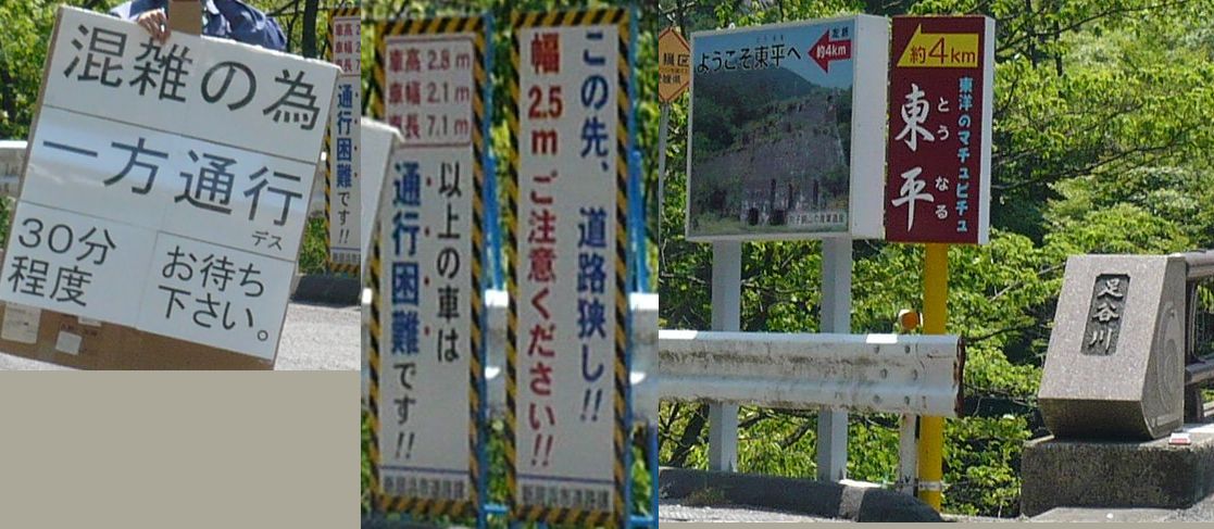 東平(とうなる)4Kmの看板と共に、車高・車幅・車長 の注意看板、